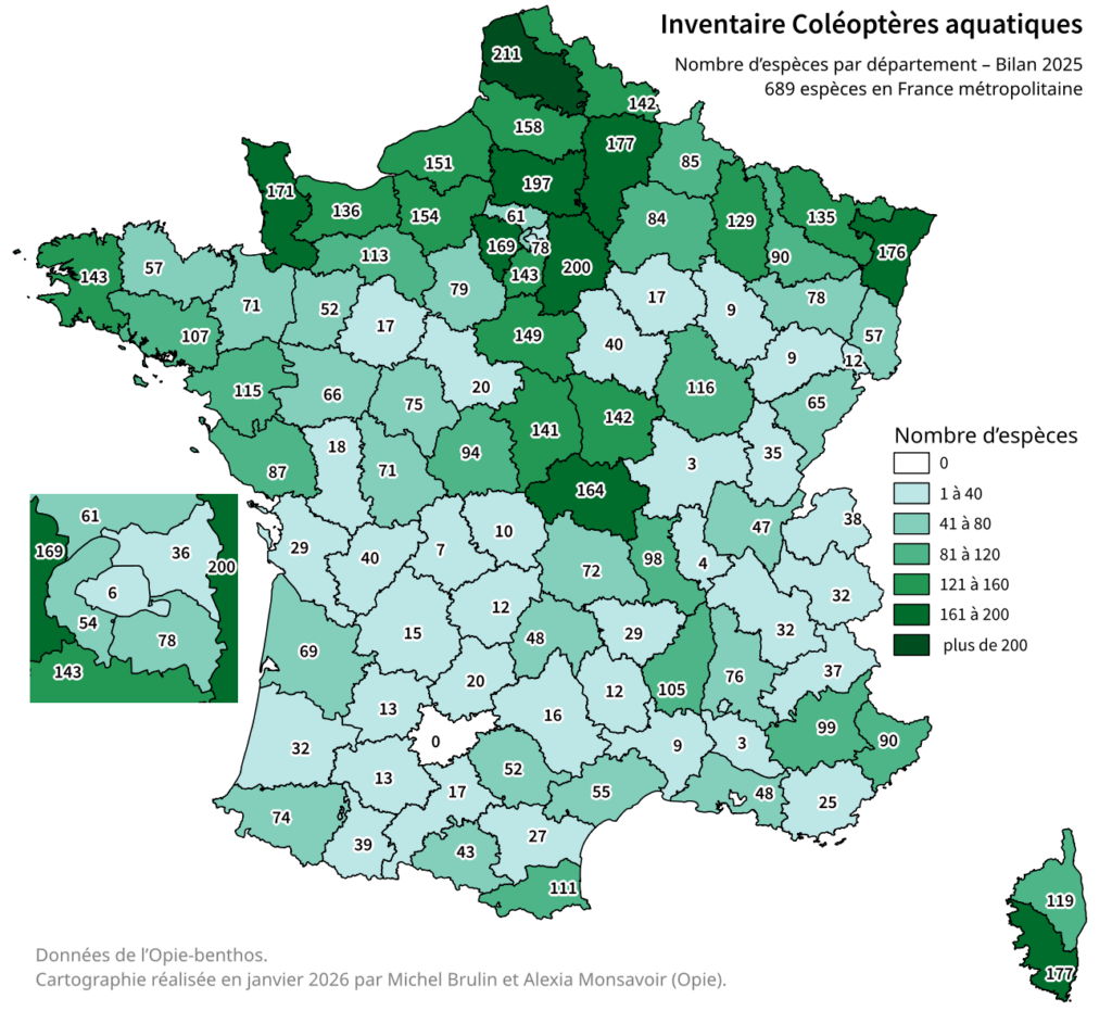 L’inventaire des Coléoptères aquatiques de France, mis en œuvre par le groupe de travail Opie-benthos, est un travail de grande ampleur, en premier lieu par le nombre des espèces concernées, qui atteint presque 700. Au 31 décembre 2025 les résultats globaux sont tout aussi encourageants que ceux des années précédentes :
