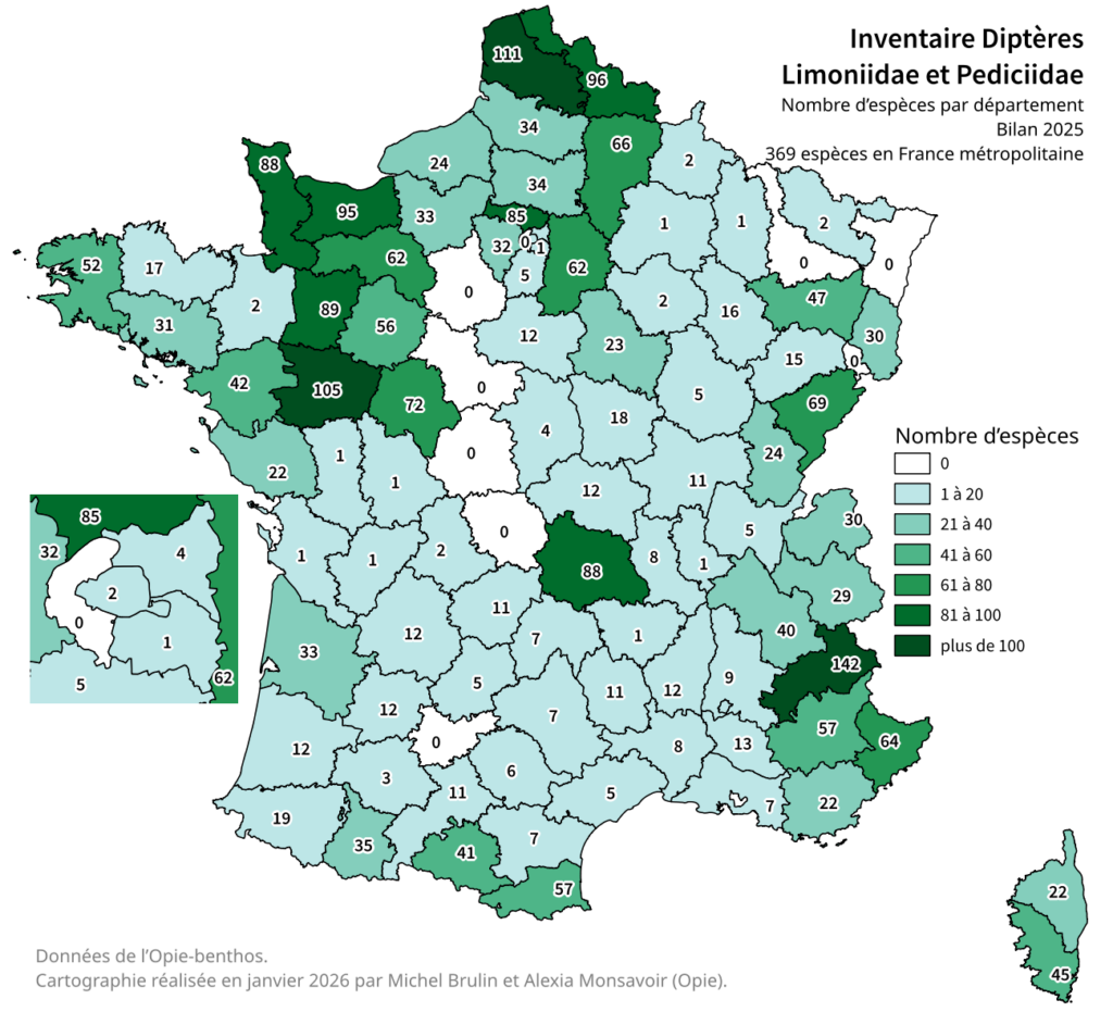 Pour sa seconde année l’inventaire des Limoniidae-Pediciidae a confirmé son beau départ, en totalisant déjà 10 200 données. La découverte d’espèces nouvelles pour la France est toujours un signe de grande vitalité, mais aussi de l’effort entrepris pour réduire les lacunes de notre connaissance. En particulier dans les Alpes, les Pyrénées, la Corse et surtout la Normandie, avec une très belle contribution 2025.