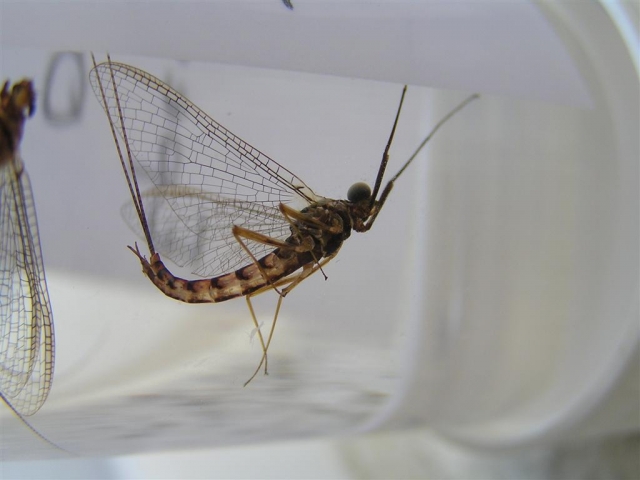 Ils seront capturés soit au filet à papillon classique (remplacer la mousseline par du tulle, plus rigide, et risquant moins de détériorer les captures), soit attirés, de nuit, avec un piège lumineux (les Trichoptères viennent généralement bien au piège lumineux). Le « parapluie japonais » est très efficace lorsqu’on prospecte des ruisseaux ou des rivières à ripisylve assez développée. De même, pour les Plécoptères, la chasse à vue avec juste ses yeux et une pince souple d’entomologiste est une méthode très intéressante, qui peut être complémentaire du parapluie. On se concentre en général sur les gros blocs rocheux émergés et les mousses qui les recouvrent, les troncs d’arbres, berges, macrophytes, ainsi que les piles des ponts et les parapets.  Méthode également intéressante pour récolter les exuvies nymphales. Dans le cas de la capture de subimagos (les « duns » des anglo-saxons) chez les Ephémères, il est préférable de les conserver vivantes SANS TOUCHER LES AILES, dans un pilulier (un gobelet en plastique transparent est idéal) recouvert de tulle ou de gaze, jusqu’à la transformation (quelques heures à quelques jours) en imago. En effet, certains caractères spécifiques sont difficilement discernables sur les subimagos. Là également, comme pour les larves, les plus grandes précautions de manipulation s’imposent, compte tenu de la fragilité de ces insectes. Les imagos seront conservées en alcool éthylique à 70 % et les mêmes règles d’étiquetage seront rigoureusement suivies.
